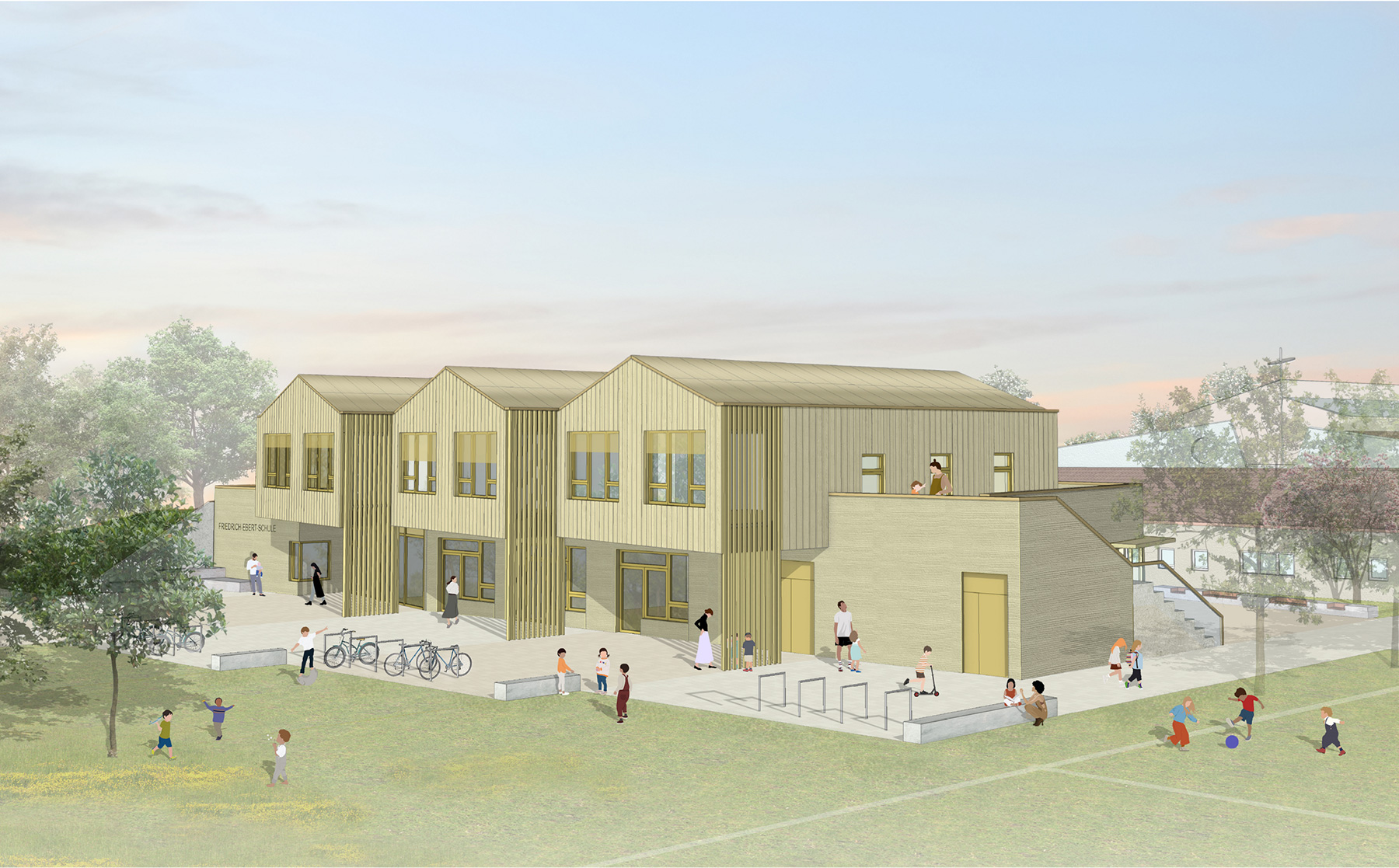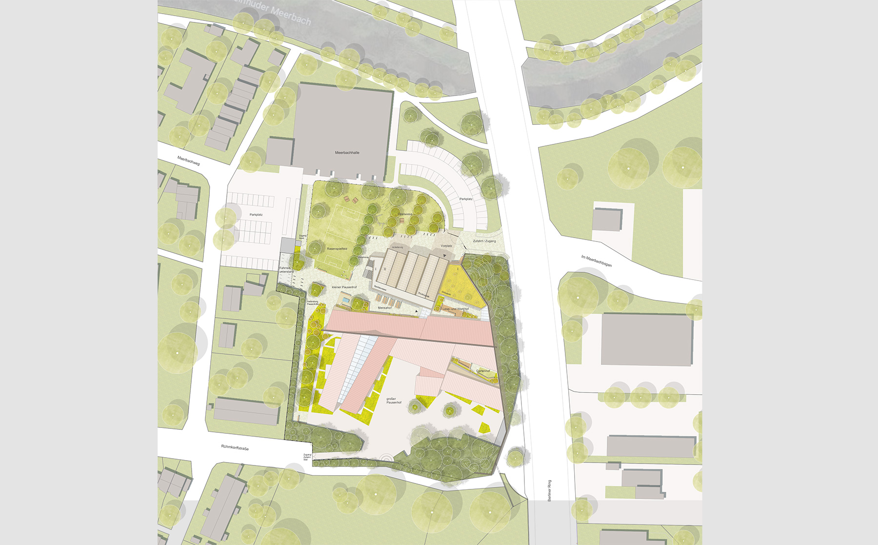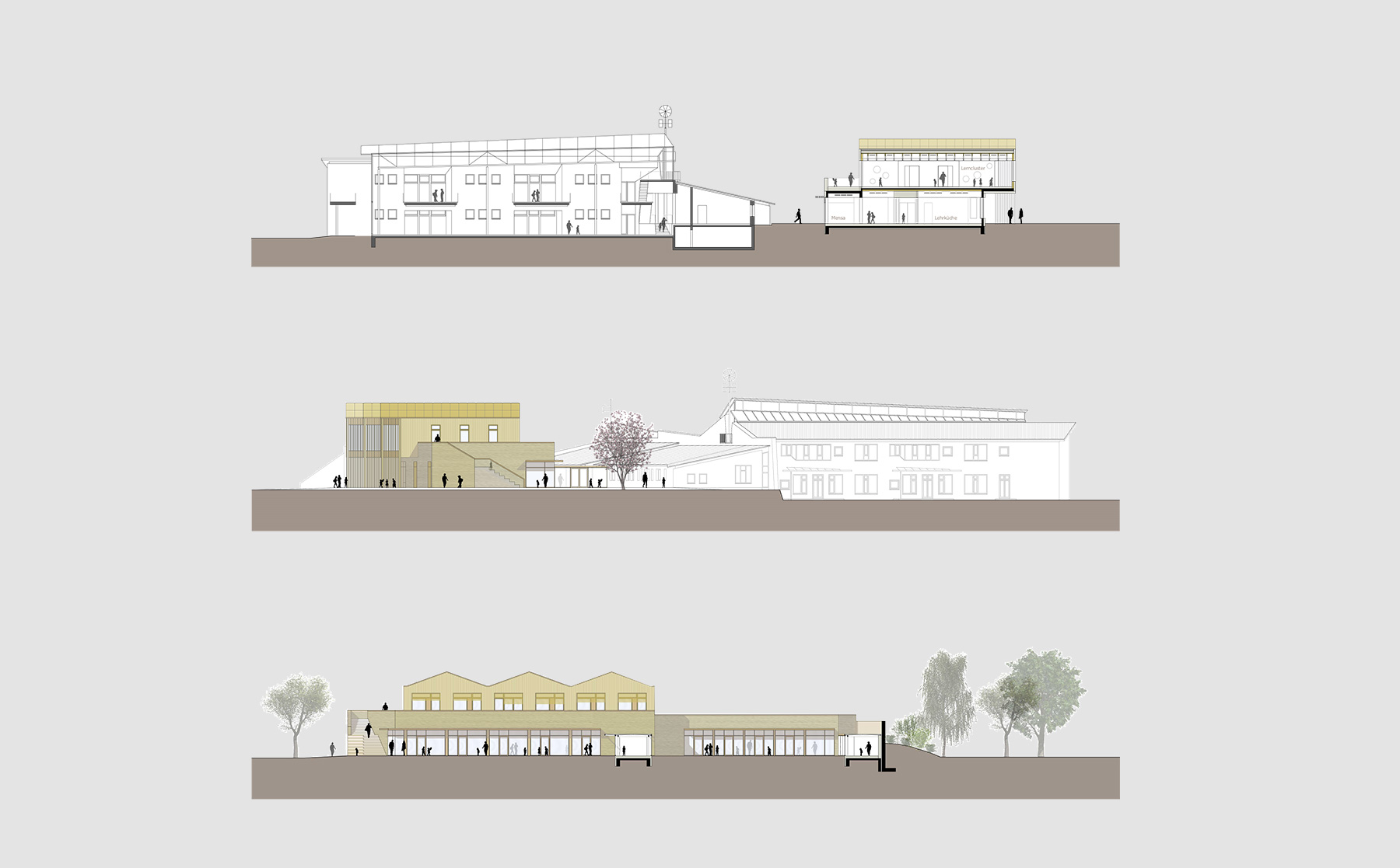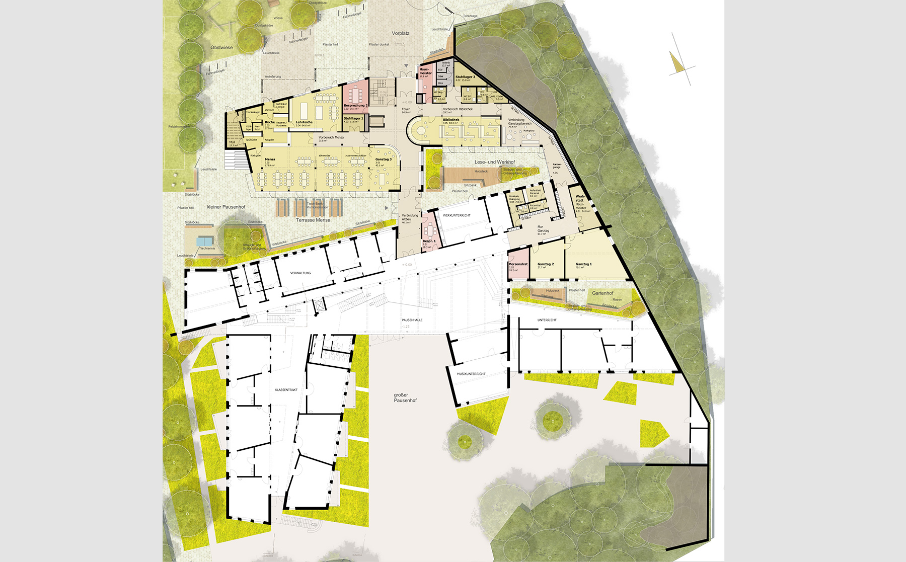 Das qualitätvolle Bestandsgebäude der Schule aus den 1990er Jahren wird im erarbeiteten Entwurf sensibel und zugleich kraftvoll nach Norden hin erweitert. Der Neubau nimmt die beiden Hauptrichtungen des stark gegliederten Altbaus sowie der städtebaulichen Strukturen der Umgebung auf und wird im Erdgeschoss an zwei Stellen durch Glasgänge an den Altbau angebunden. Durch Form und Platzierung entstehen so in Entsprechung zum Altbau zwei neue trapezförmige Höfe. Der Haupteingang für das gesamte Schulgebäude ist in Verlängerung der bisherigen Erschließungsachse nach Norden - am neuen Vorplatz - platziert.
