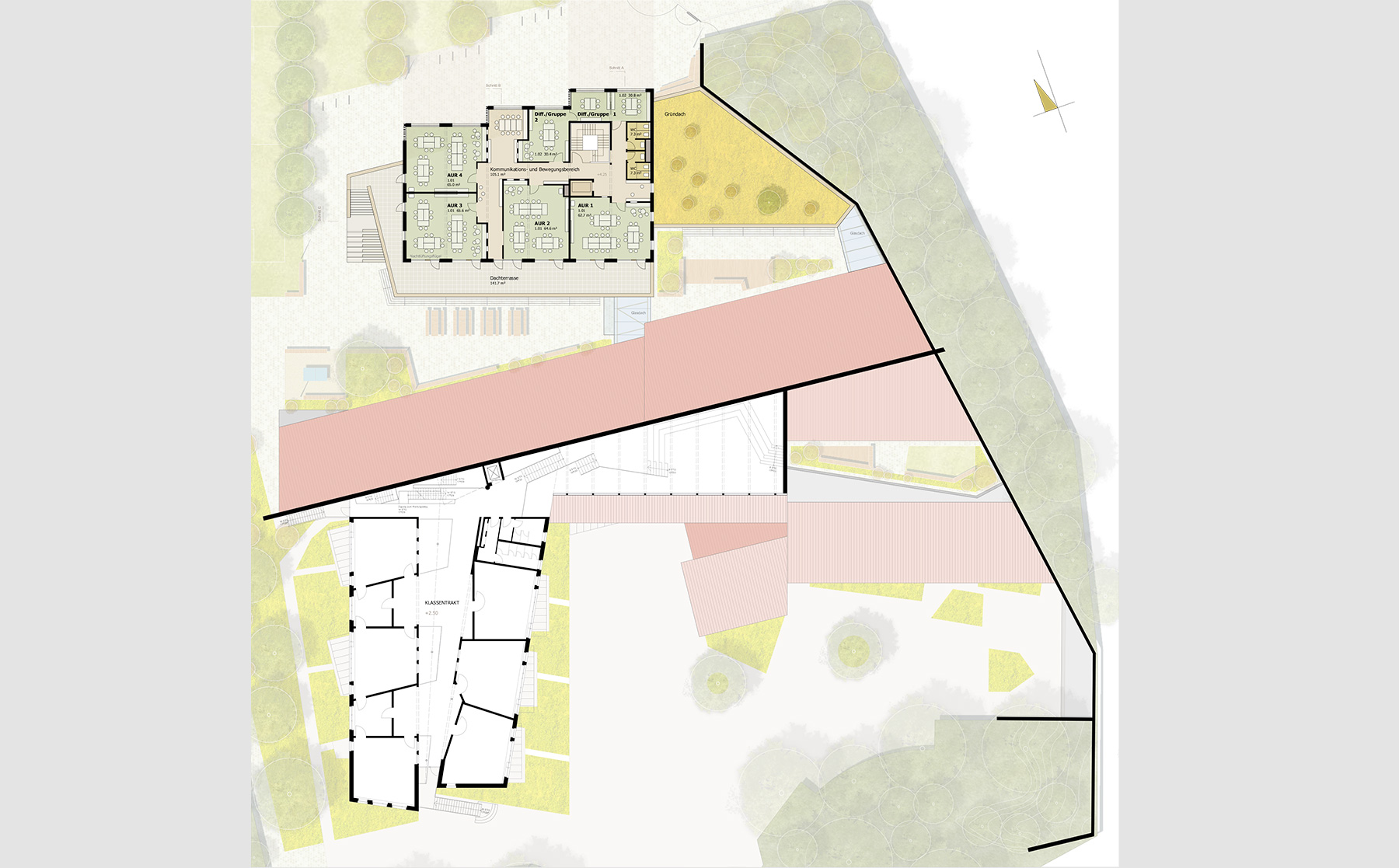 Das Foyer ist als fließender Bewegungsraum konzipiert und bindet alle Funktionsbereiche an: die Treppenraumerschließung zum Ober- und Untergeschoss und den Aufzug, den Mensa- und Lehrküchenbereich, die neuen Meetingräume für Besprechungen, Bibliothek und Ganztagsbereich sowie den Altbau mit der großen Pausenhalle. Der Raumkörper der Bibliothek schiebt sich mit seiner runden Apsiswand skulptural in das Foyer und öffnet sich zum neuen Lese- und Werkhof: innen und außen entstehen so unterschiedliche Lese-, Rückzugs- und Kommunikationsbereiche. Das Obergeschoss beherbergt den neuen Lerncluster mit Unterrichts- und Differenzierungsräumen, die für unterschiedliche Gruppengrößen zusammenschaltbar sind. Die Erschließungsfläche weitet sich an drei Stellen zu unterschiedlichen Kommunikationsbereichen auf, jeweils mit direktem Zugang zum Außenbereich der Dachterrasse. Durch Sichtbeziehungen zwischen allen Bereichen entsteht eine vielfältige, aber einsehbare Lernlandschaft.