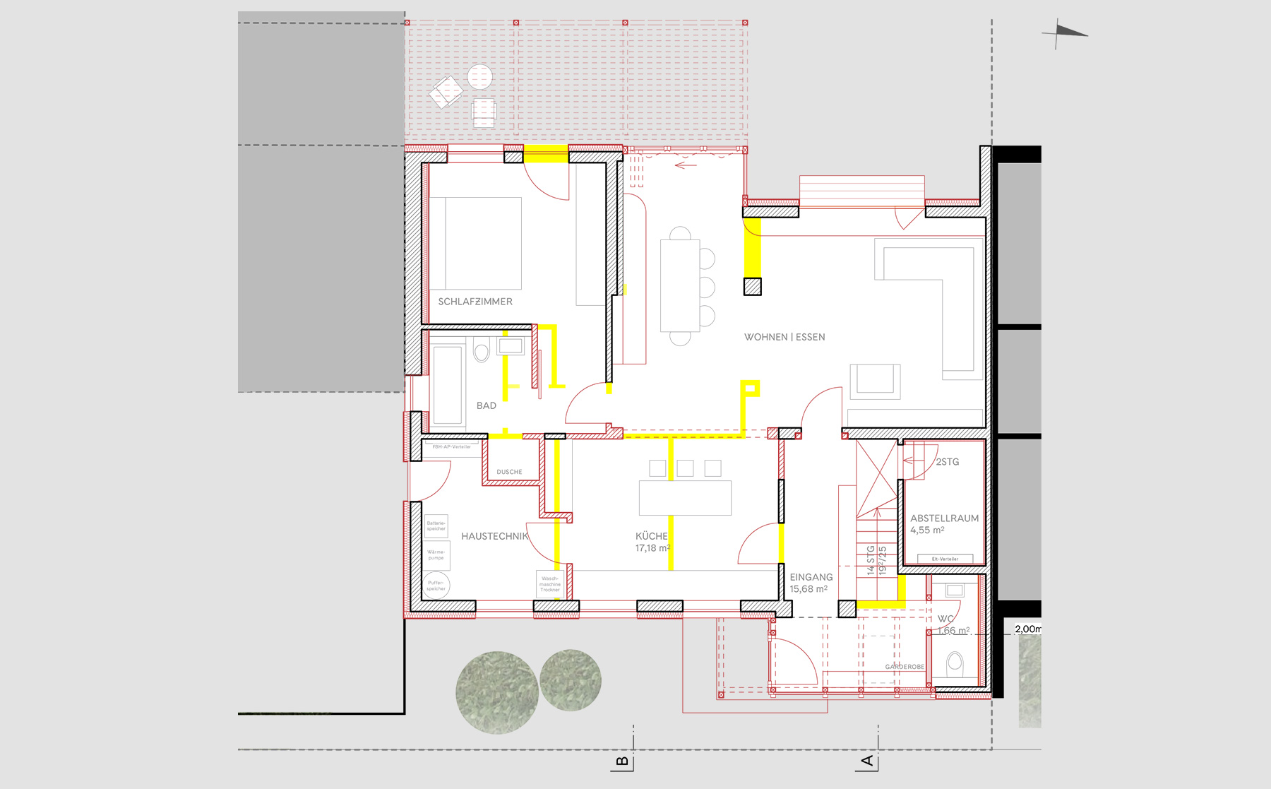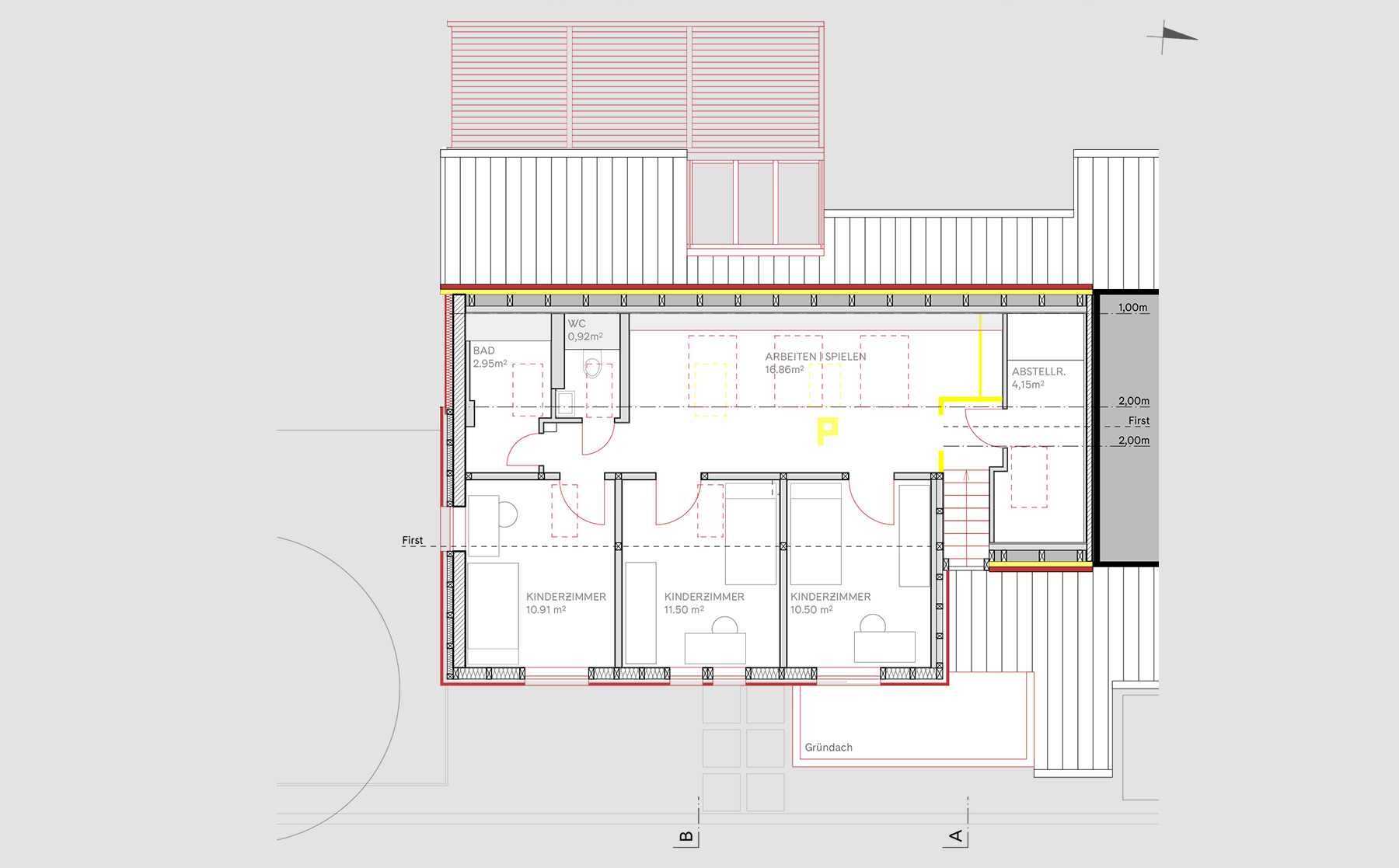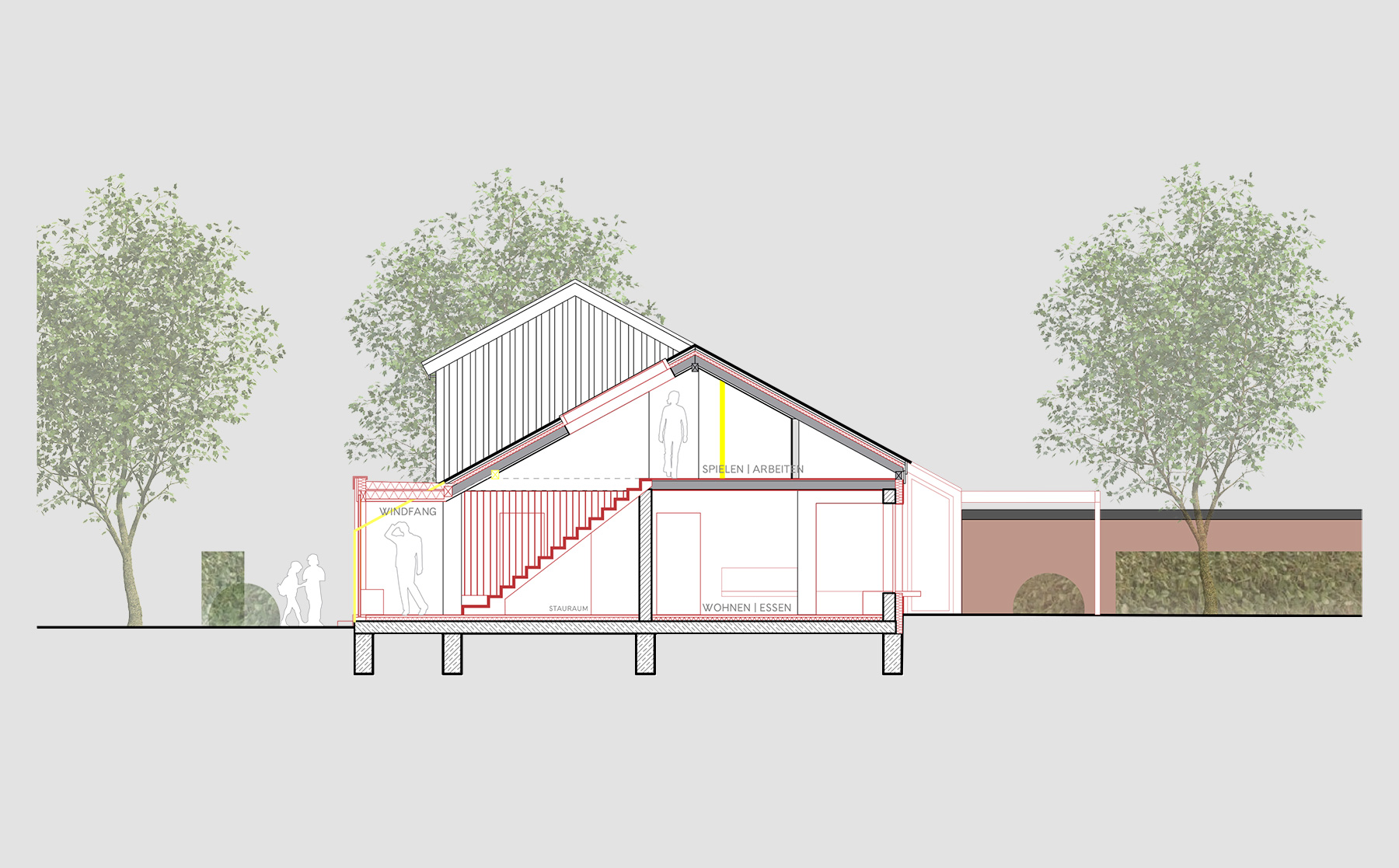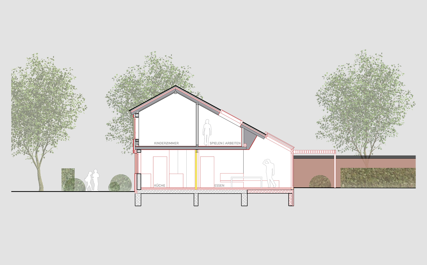 Im Erdgeschoss des Einfamilienhauses wurden die ehemals kleinteiligen Raumzuschnitte zugunsten großzügiger Raumzusammenhänge neu organisiert. Im Zentrum des Hauses ist ein offener Wohn-, Ess- und Kochbereich mit fließenden Übergängen entstanden. Der zum Garten orientierte Essbereich wurde durch eine wintergartenähnliche Erweiterung mit großflächigen Verglasungen ausgestattet, die viel Tageslicht ins Gebäudeinnere bringen und den Innenraum optisch mit dem Außenraum verbinden. Das angrenzende Schlafzimmer erhielt über eine neue Terrassentür direkten Zugang zum Garten sowie ein eigenes Ensuite-Bad. Ergänzt wird das Erdgeschoss durch einen Haustechnikraum, einen Abstellraum und einen neu errichteten, vorgelagerten Windfang mit Gäste-WC, der den Eingangsbereich funktional ordnet und architektonisch aufwertet. Eine neu gestaltete Treppe im Flur verbindet die beiden Geschossebenen. Im Dachgeschoss wurde ein freundlicher, offener Arbeits- und Spielbereich geschaffen, von dem drei weitere Zimmer sowie das Bad, ein separates WC und ein Abstellraum erschlossen werden.