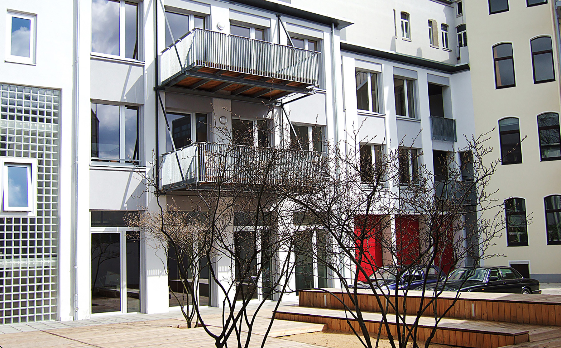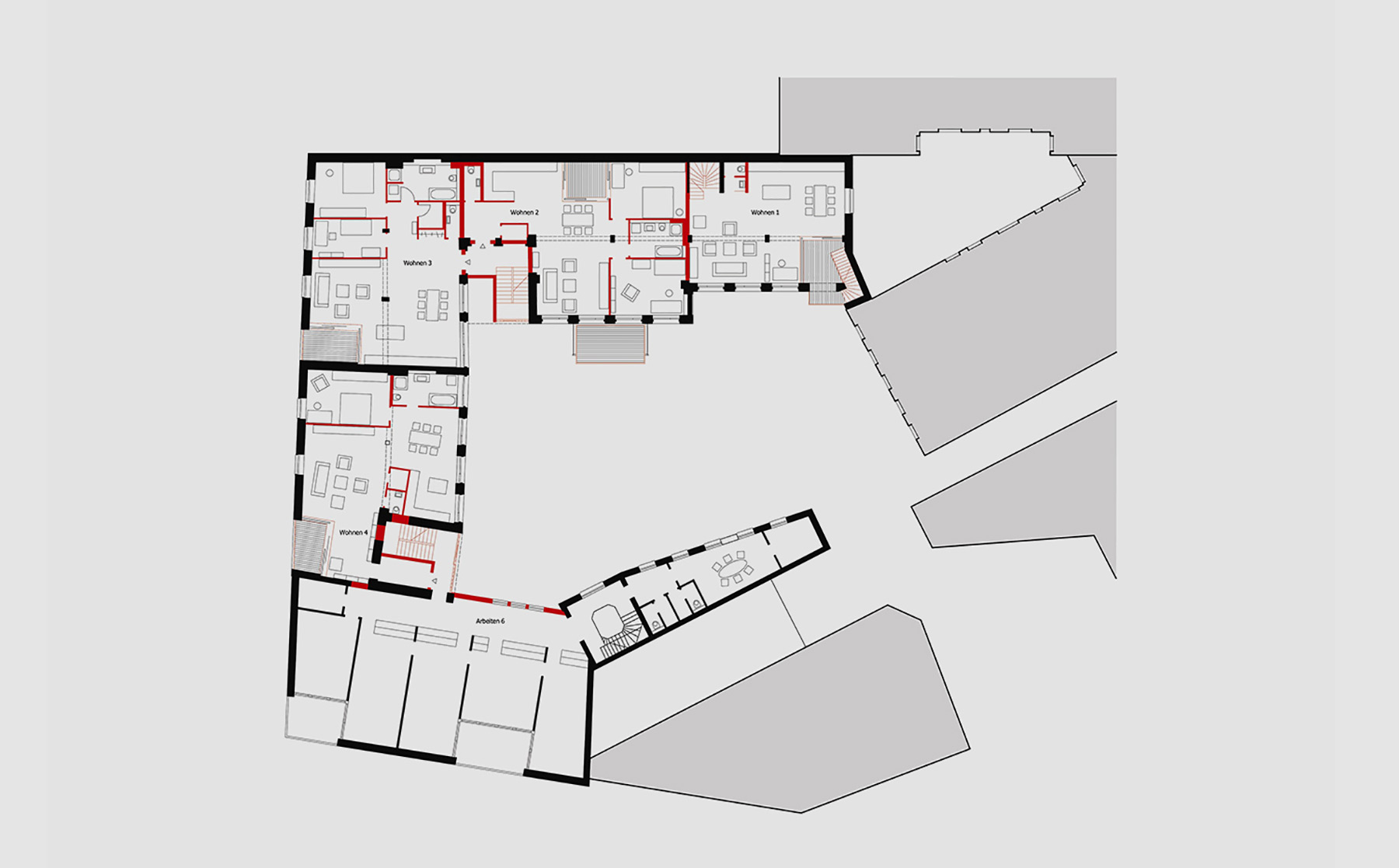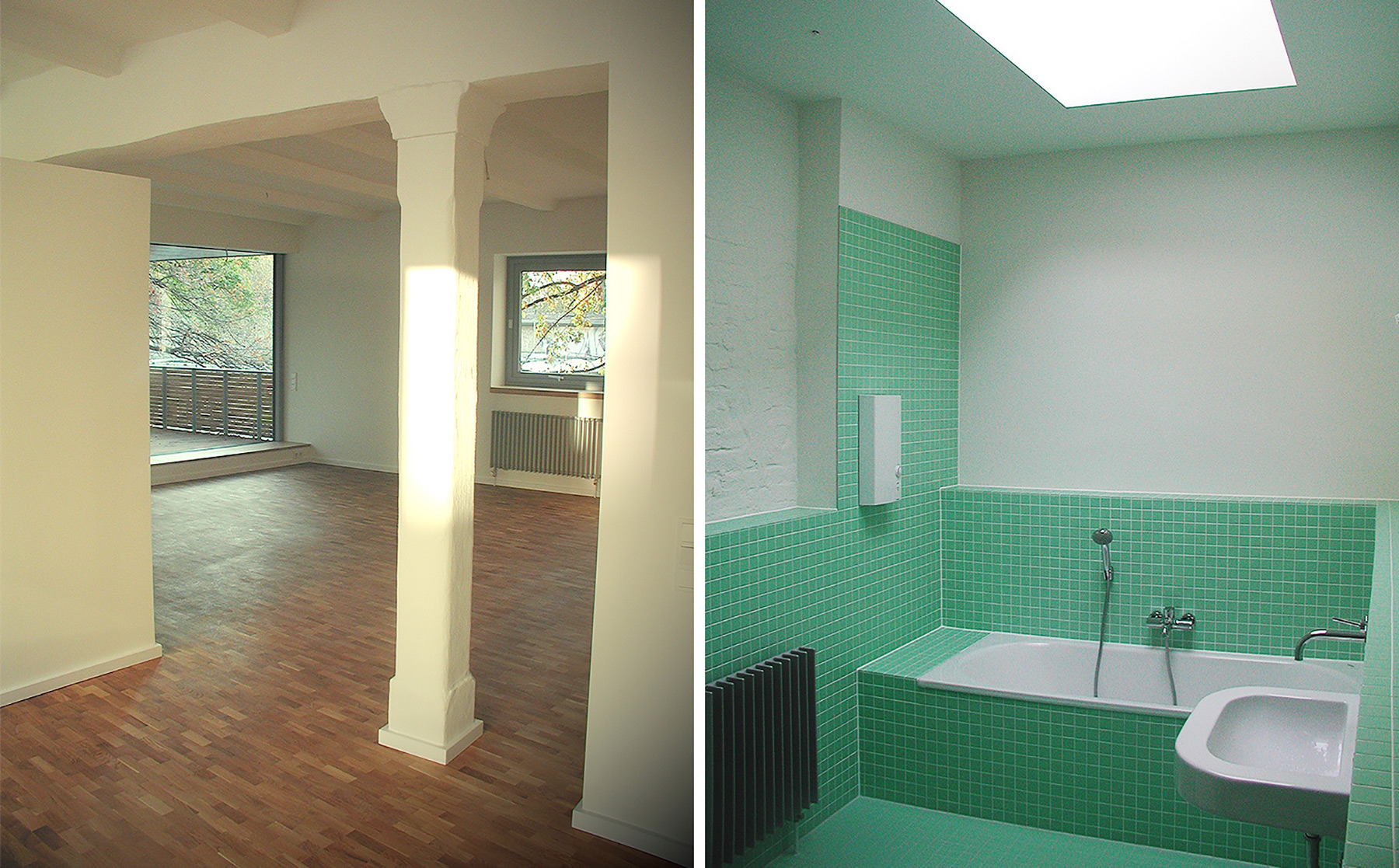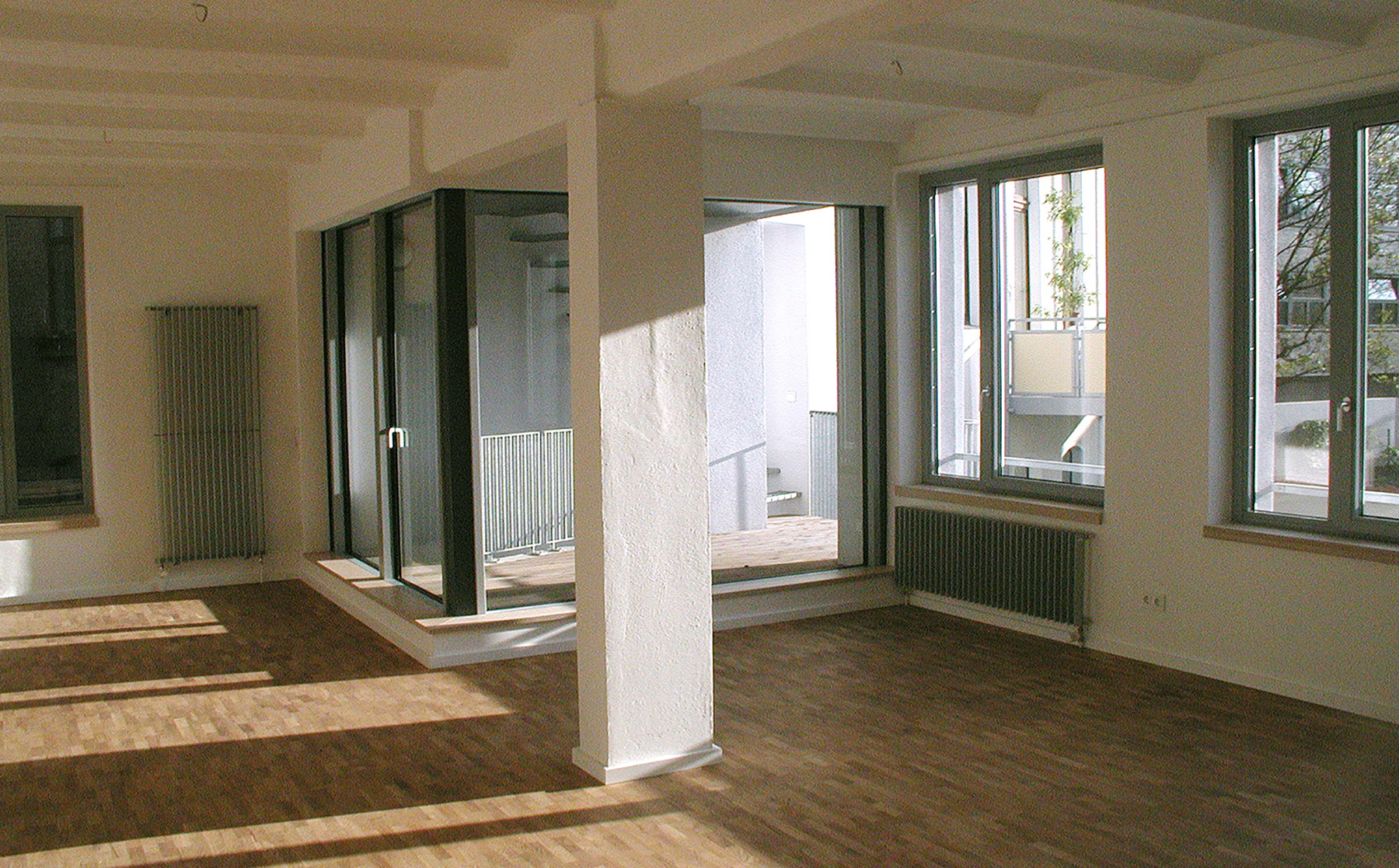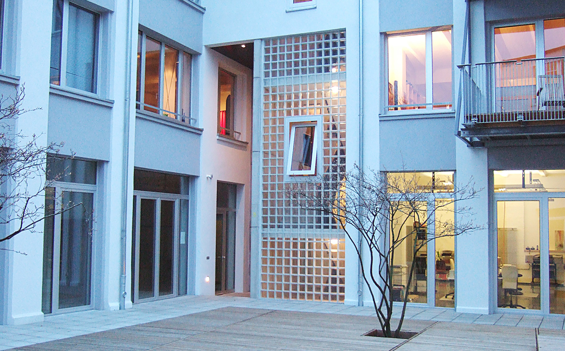 Die vorhandene Gebäudestruktur mit insgesamt 1.670 m² Haupt- und 570 m² Nebennutzfläche ermöglichte flexible Grundrisseinteilungen in zwölf Einheiten von 50 bis 450 m². Entstanden sind zwei Ateliers und drei Büros im Erd- und ersten Obergeschoss sowie sieben Loftwohnungen im 1. und 2. OG (zwischen 115 und 150 m²).
