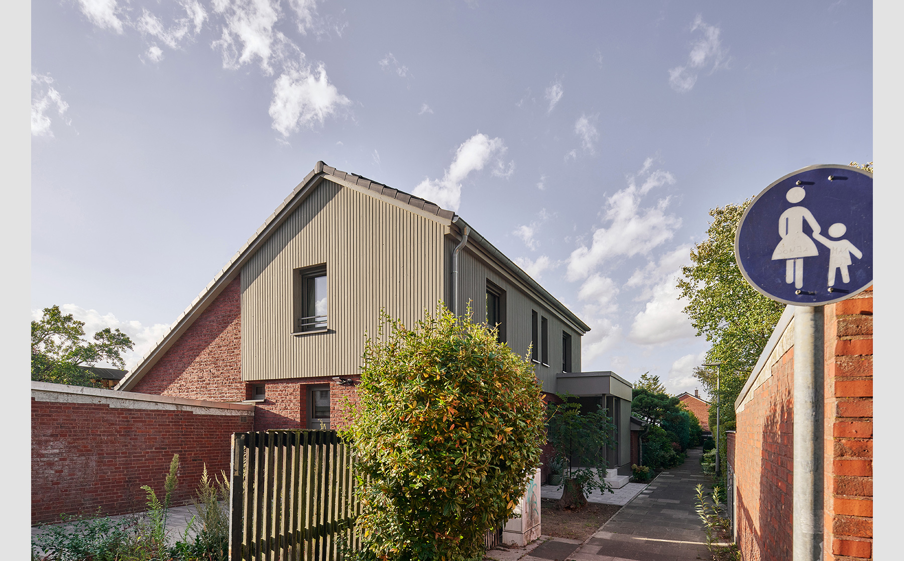 Das 1959 erbaute und in den 1990ern aufgestockte Reihenhaus im Stadtteil Badenstedt wurde umfassend saniert, an heutige Wohnbedürfnisse angepasst und energetisch ertüchtigt. Das Wohnhaus ist Teil eines größeren, noch weitgehend homogenen Gebäudeensembles und markiert als südlicher Kopfbau den Abschluss einer Zeile aus vier bungalowartigen Reihenhäusern.