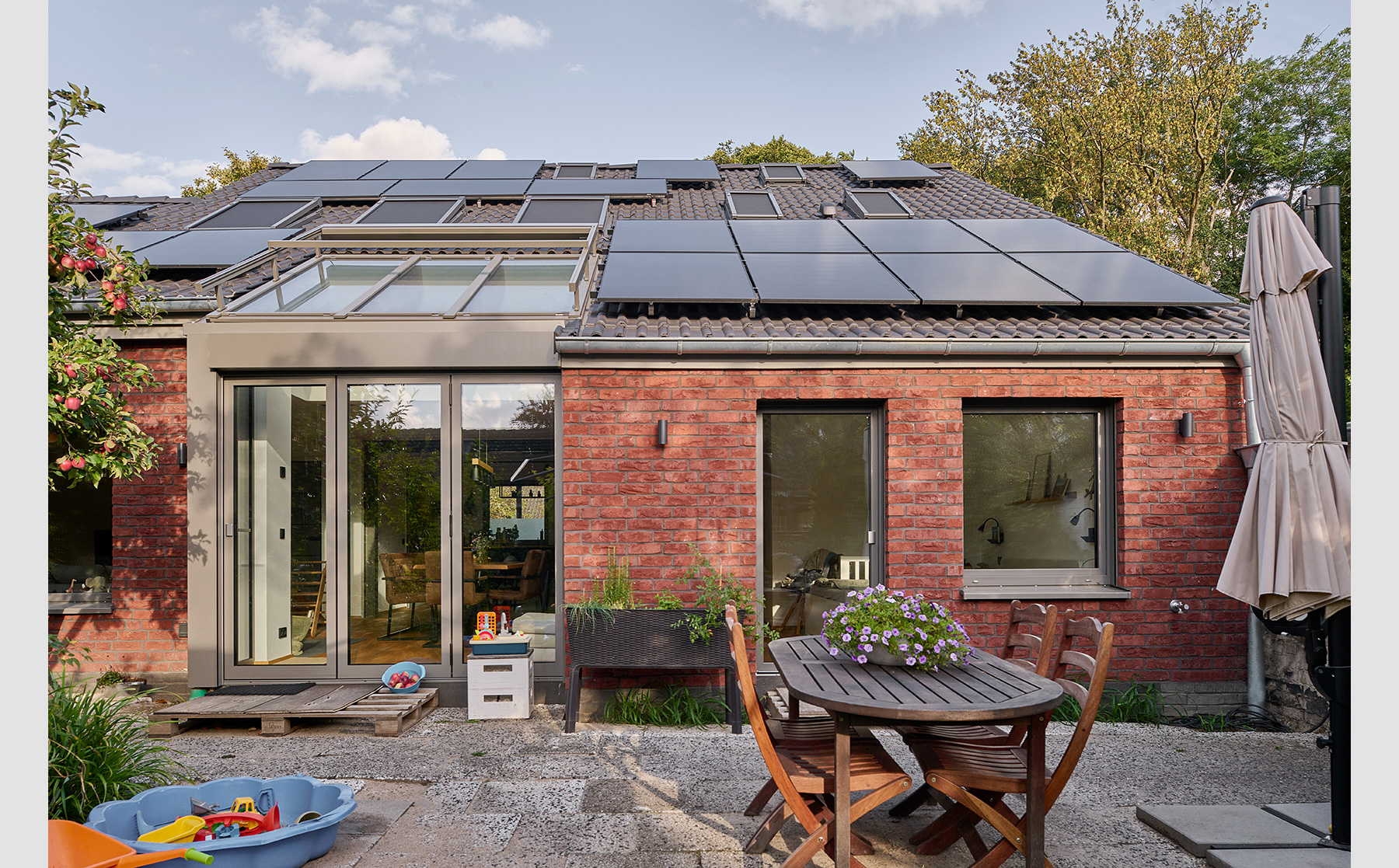 Eine neue Photovoltaikanlage auf dem Dach erzeugt Strom aus erneuerbaren Energien. Das vormals gemischte Heizsystem aus Kachelofen, Nachtspeicherheizungen und Gastherme wurde durch eine Luftwärmepumpe mit Flächenheizung ersetzt. Entstanden ist ein KfW-Effizienzhaus 85 EE (nach BEG GEG 2023).