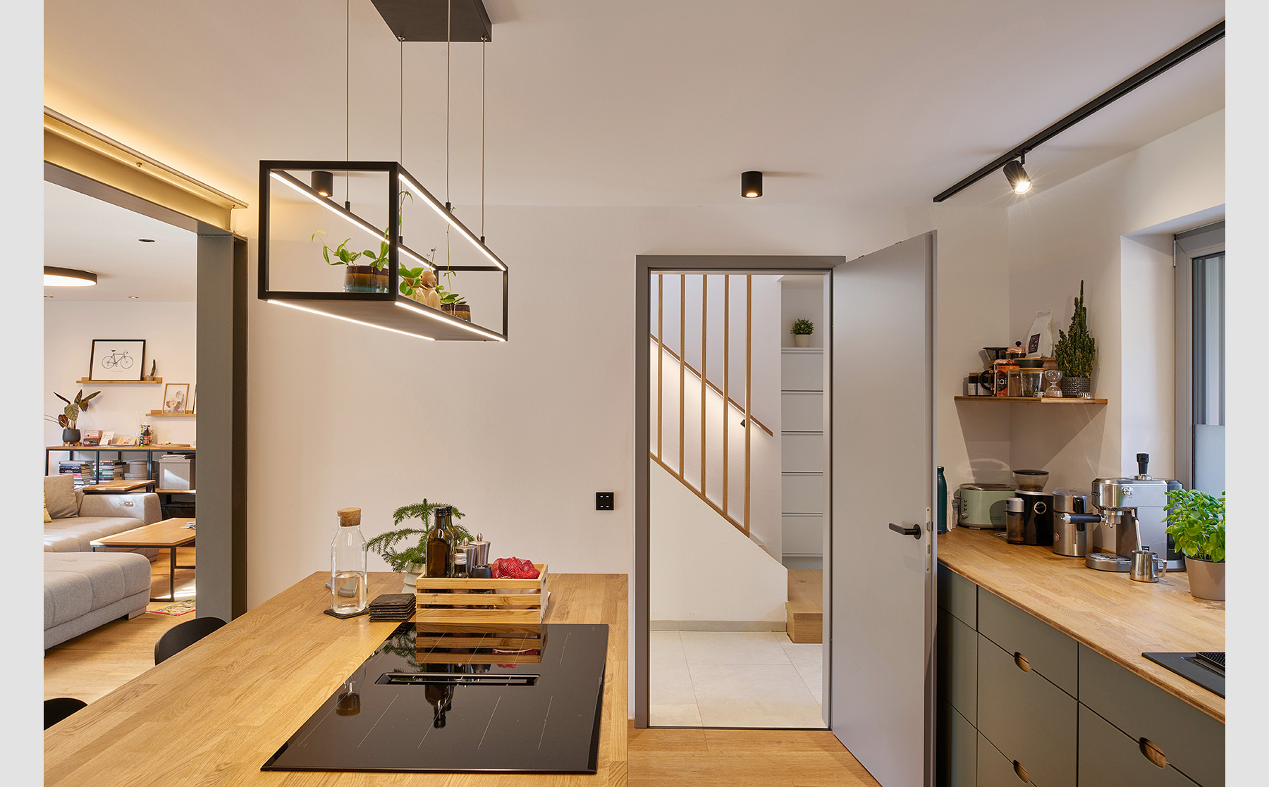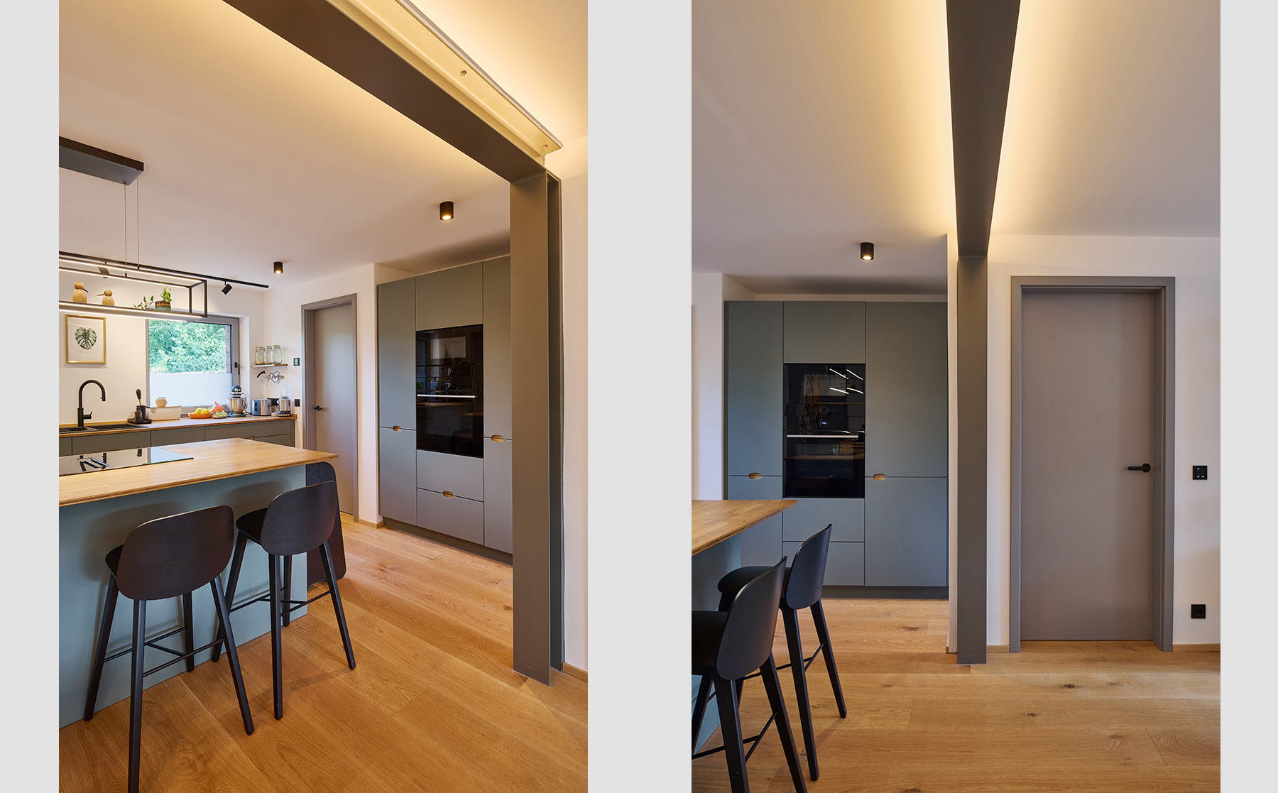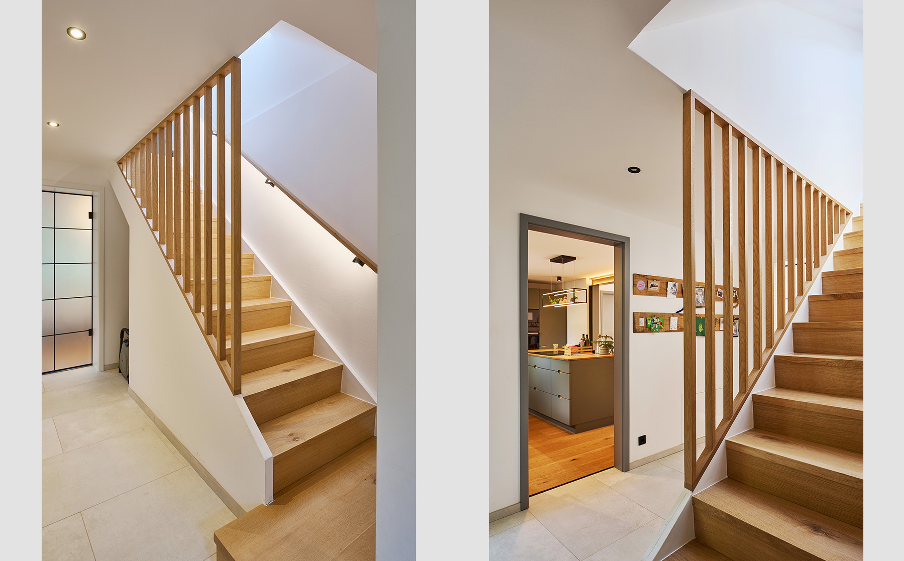 Im Erdgeschoss des Einfamilienhauses wurden die ehemals kleinteiligen Raumzuschnitte zugunsten großzügiger Raumzusammenhänge neu organisiert. Im Zentrum des Hauses ist ein offener Wohn-, Ess- und Kochbereich mit fließenden Übergängen entstanden. Der zum Garten orientierte Essbereich wurde durch eine wintergartenähnliche Erweiterung mit großflächigen Verglasungen ausgestattet, die viel Tageslicht ins Gebäudeinnere bringen und den Innenraum optisch mit dem Außenraum verbinden. Das angrenzende Schlafzimmer erhielt über eine neue Terrassentür direkten Zugang zum Garten sowie ein eigenes Ensuite-Bad. Ergänzt wird das Erdgeschoss durch einen Haustechnikraum, einen Abstellraum und einen neu errichteten, vorgelagerten Windfang mit Gäste-WC, der den Eingangsbereich funktional ordnet und architektonisch aufwertet. Eine neu gestaltete Treppe im Flur verbindet die beiden Geschossebenen. Im Dachgeschoss wurde ein freundlicher, offener Arbeits- und Spielbereich geschaffen, von dem drei weitere Zimmer sowie das Bad, ein separates WC und ein Abstellraum erschlossen werden.